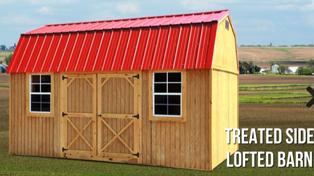 and lofted. The standard barn has 4' walls and the lofted barn has 6'3" walls with lofts on each side. You'll choose from three different finish options such as pressure treated, painted and polyurethane treated. The roofing options include architectural shingles or a metal roof.